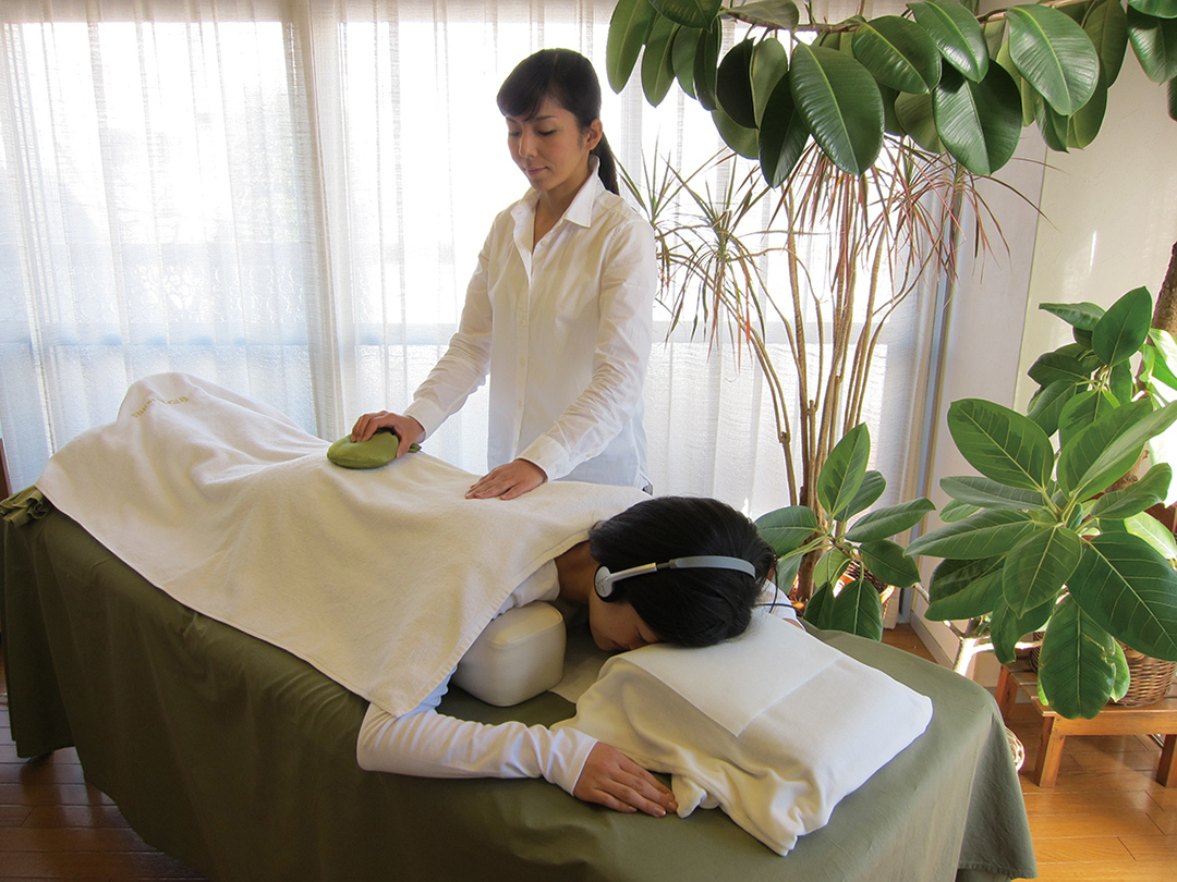 音波を伝える小型のサウンドクッションを腰、肩、足などにあて全身を活性化し血流とリンパの流れをよくします。最後に腰と背中を丁寧にケアします。