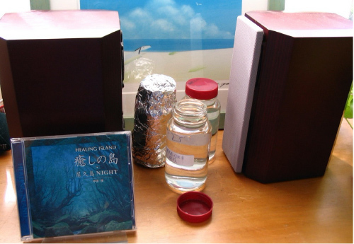 スピーカーから流れる屋久島の自然音の空気振動のエネルギーは、水道水の残留塩素の害作用を解除し、且つ溶質と溶媒水との結合関係を緩め、同時に水の機能を発揮しています。水の改質方法としては最も効果的改良方法の一つといえます。水は誘電体の凝集場であり、一時も休むことなく、交番的に動いている導電体流体です。 本分析で推測される交番磁束が水の電気エネルギーに影響するのはファラデーの電磁誘導の法則に鑑み自明の理であると述べても言い過ぎではないでしょう。